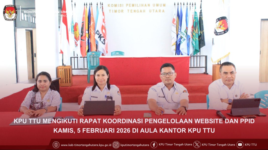 #TemanPemilih, Komisi Pemilihan Umum Kabupaten Timor Tengah Utara mengikuti Rapat Koordinasi Pengelolaan Website dan Pejabat Pengelola Informasi dan Dokumentasi (PPID) yang diselenggarakan oleh KPU Propinsi NTT secara daring melalui Zoom Meeting pada Kamis, 4 Februari 2026, bertempat di Aula Kantor KPU Kabupaten TTU.