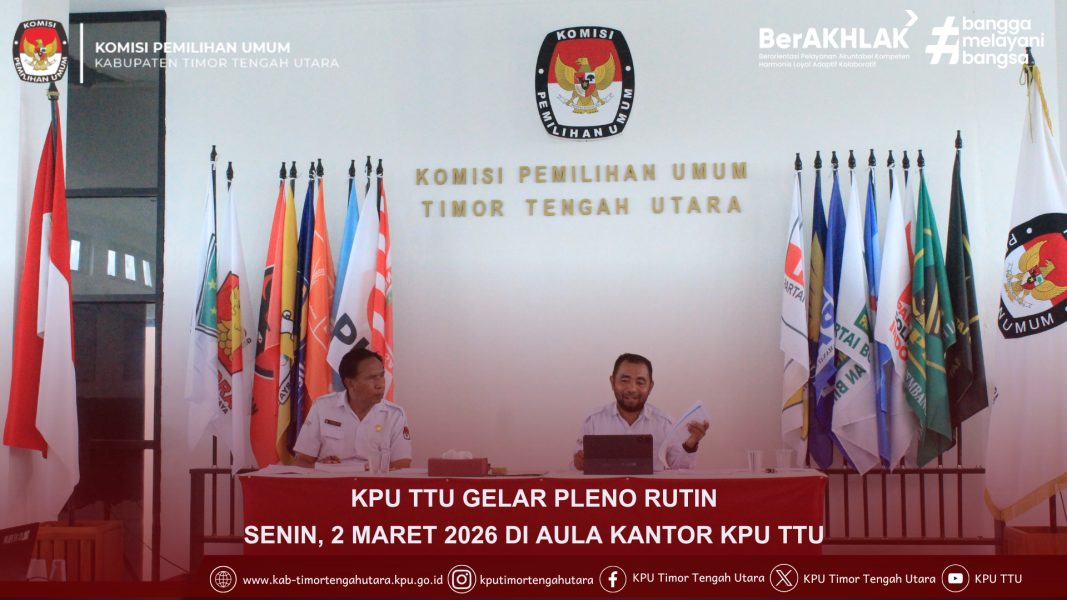 Kefamenanu,kab-timortengahutara.kpu.go.id - Hari ini Senin, 2 Maret 2026, Komisi Pemilihan Umum Kabupaten Timor Tengah Utara melaksanakan Rapat Pleno Rutin di Aula KPU Kabupaten TTU. Rapat tersebut dipimpin oleh Ketua dan dihadiri oleh Anggota KPU Kabupaten TTU, Sekretaris, serta para pejabat struktural di lingkup Sekretariat KPU Kabupaten TTU.