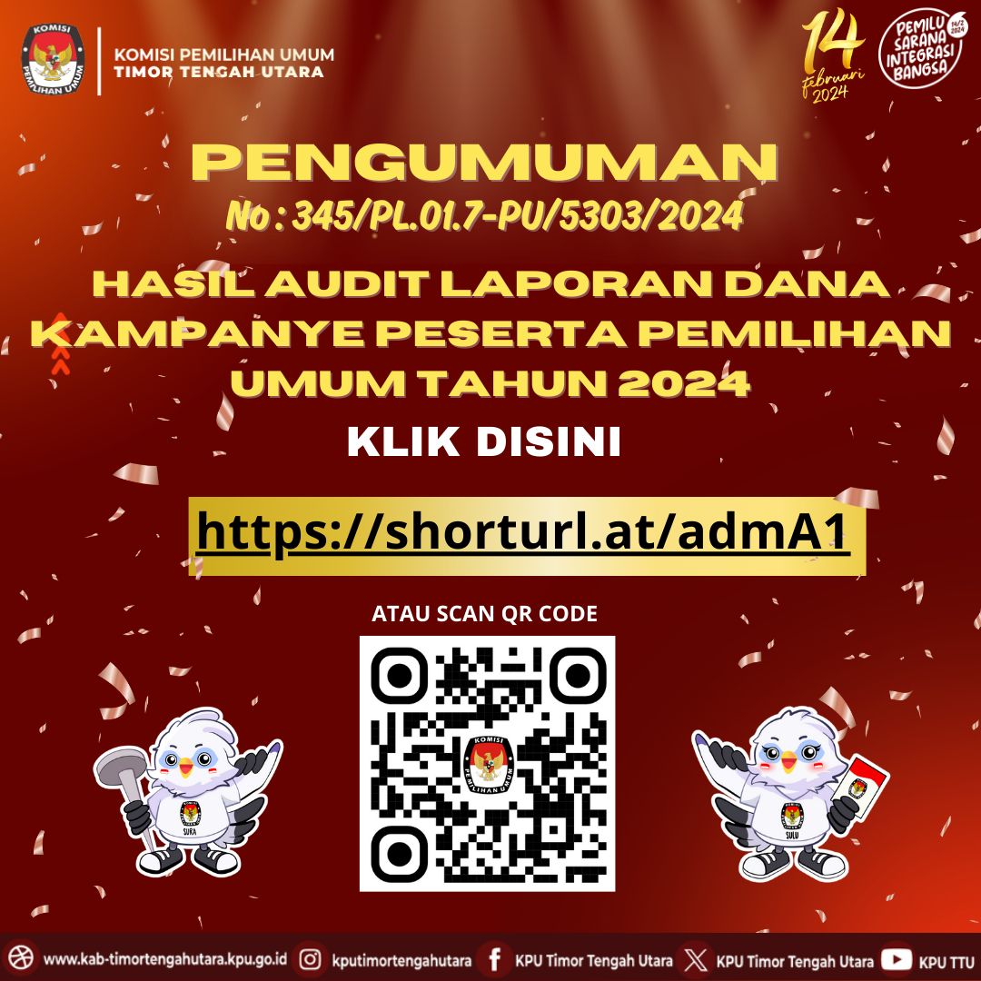 Pengumuman Nomor : 345/PL.01.7-Pu/5303/2024 Tentang Hasil Audit Laporan Dana Kampanye Peserta Pemilihan Umum Tahun 2024.
