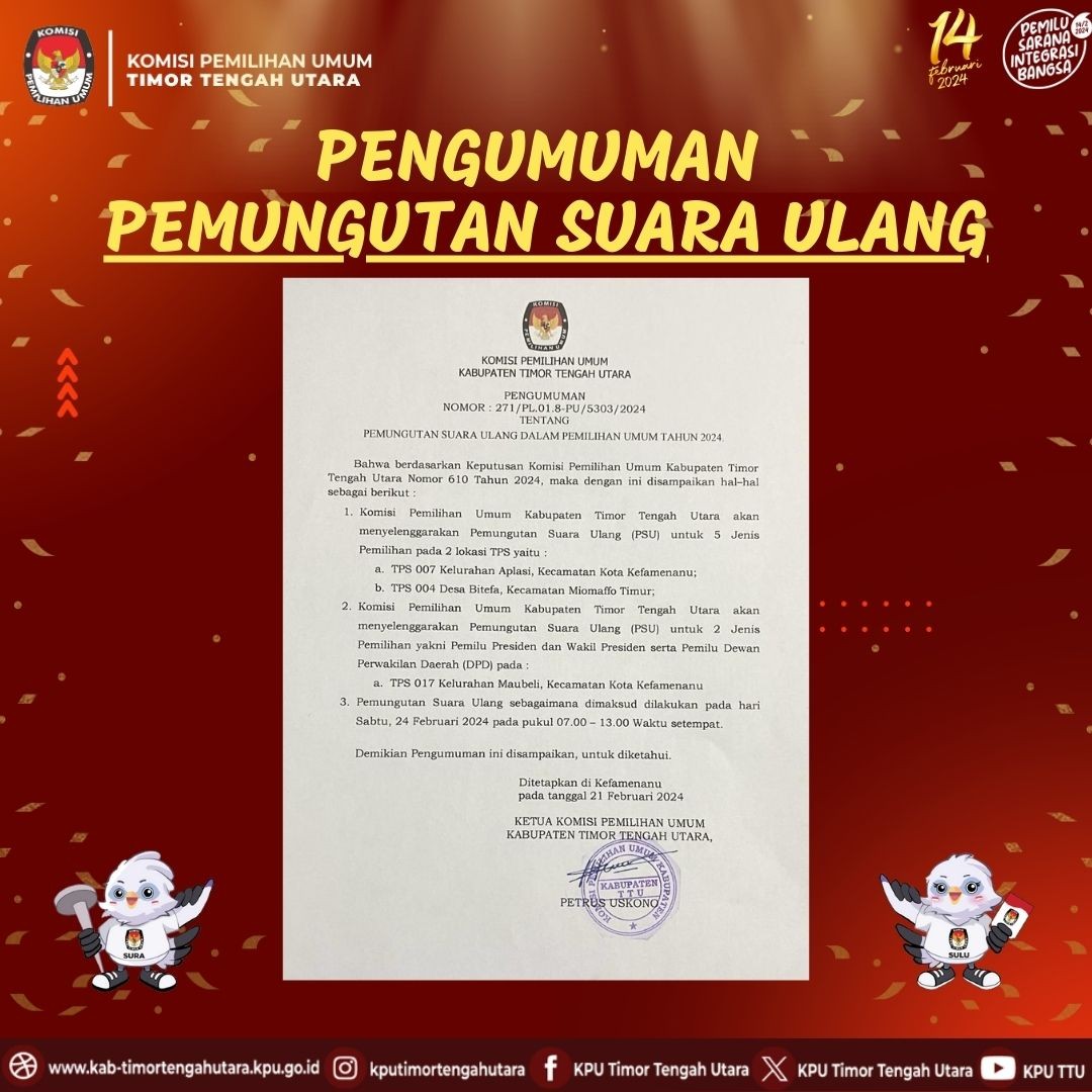 Berdasarkan keputusan Komisi Pemilihan Umum Kabupaten TTU Nomor 610 Tahun 2024, maka disampaikan bahwa Komisi Pemilihan Umum Kabupaten TTU akan menyelenggarakan PSU untuk 5 jenis surat suara pada 2 lokasi TPS yaitu TPS 007 Aplasi Kecamatan Kota Kefamenanu dan TPS 004 Bitefa Kecamatan Miomaffo Timur, serta menyelenggarakan PSU untuk 2 jenis surat suara pada 1 TPS yaitu TPS 017 Maubeli Kecamatan Kota Kefamenanu.