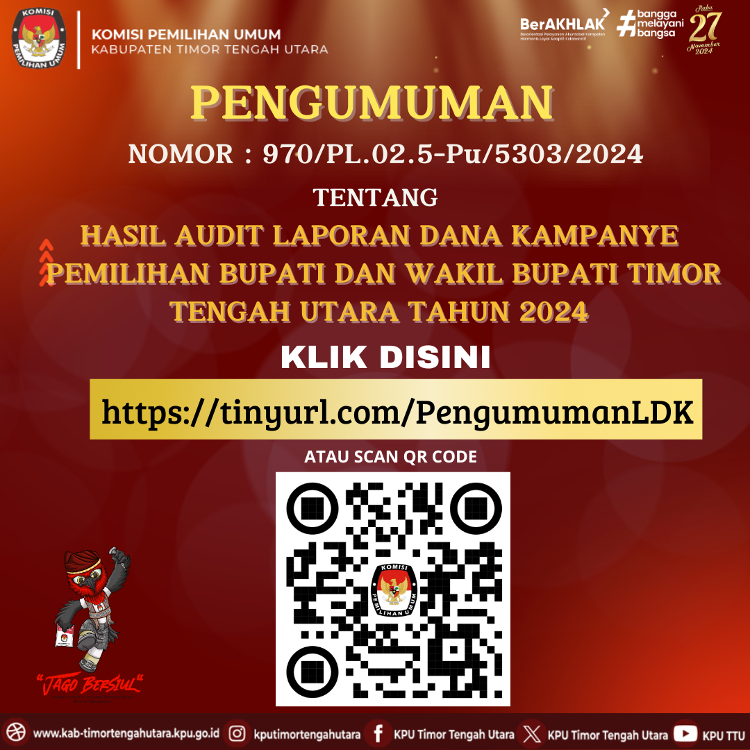 Pengumuman Nomor : 970/PL.02.5-Pu/5303/2024 Tentang Pengumuman Hasil Audit Laporan Dana Kampanye Pemilihan Bupati dan Wakil Bupati Kabupaten Timor Tengah Utara Tahun 2024
