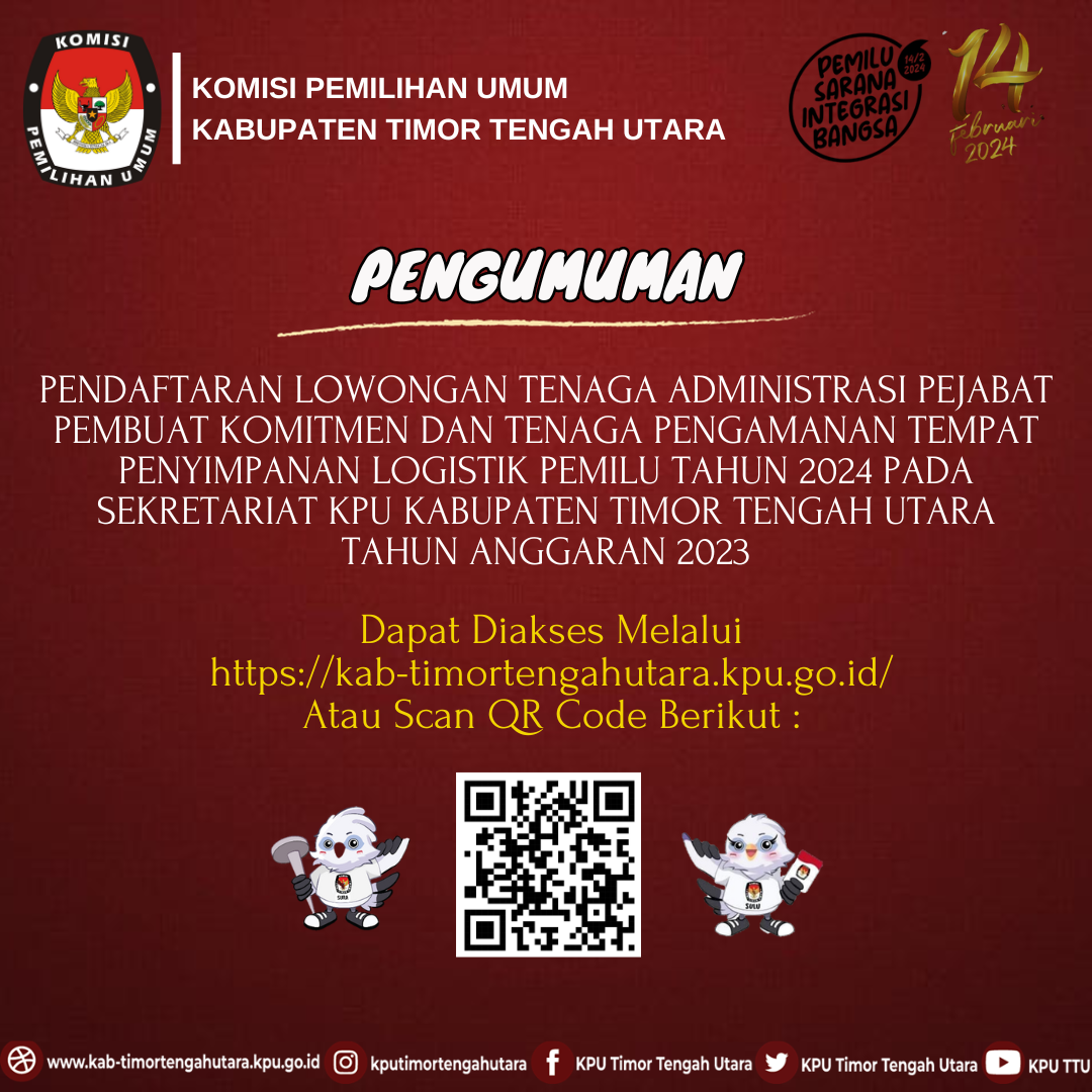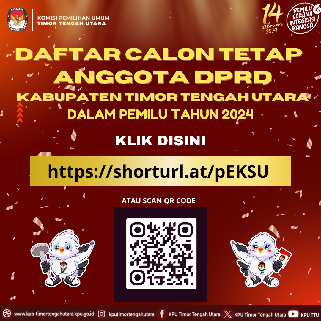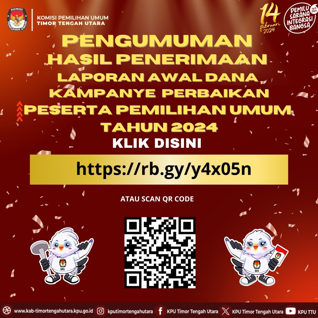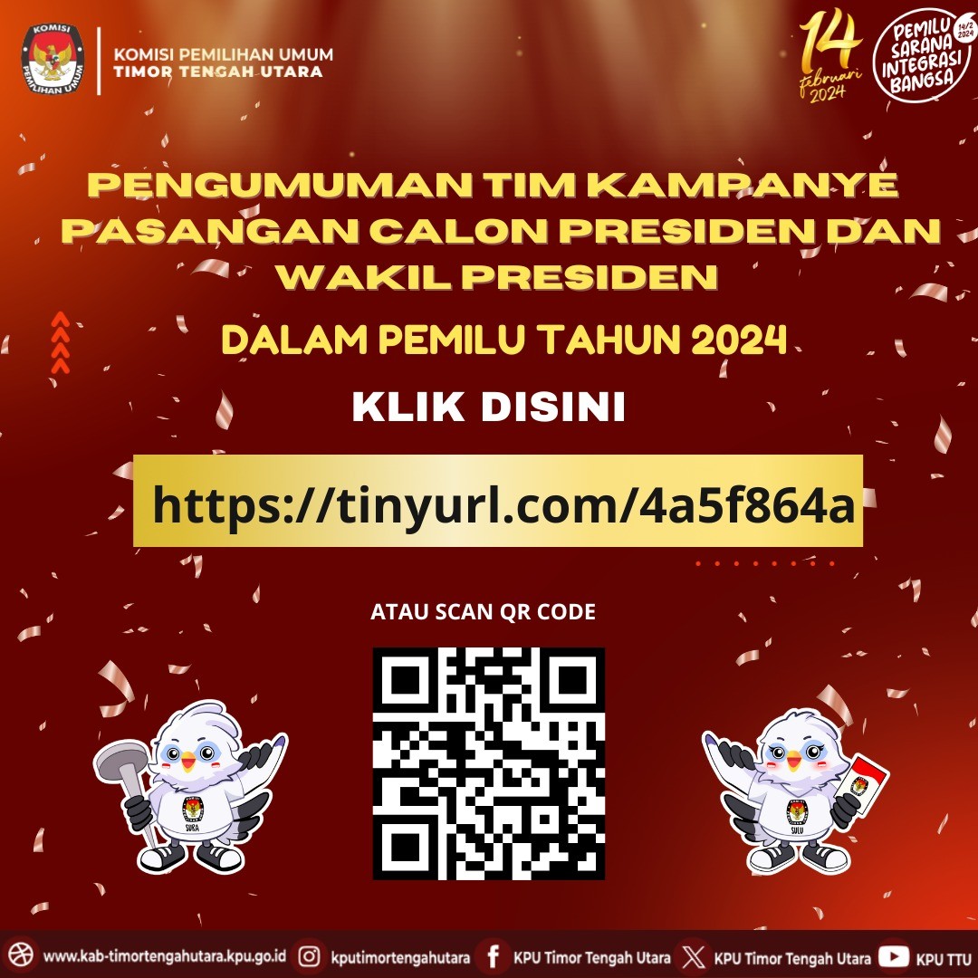 Bahwa berdasarkan Pasal 12 Peraturan Komisi Pemilihan Umum Nomor 15 Tahun 2023 tentang Kampanye Pemilihan Umum, Maka Komisi Pemilihan Umum Kabupaten Timor Tengah Utara mengumumkan Tim Kampanye Pasangan Calon Presiden dan Wakil Presiden Nomor urut 1. Anies Rasyid Baswedan dan A. Muhaimin Iskandar; nomor urut 2. H Prabowo Subianto dan Gibran Rakabuming Raka; dan nomor urut 3. H. Ganjar Pranowo, S.H., M.I.P dan Prof. Dr. H. Moh. Mahfud MD.